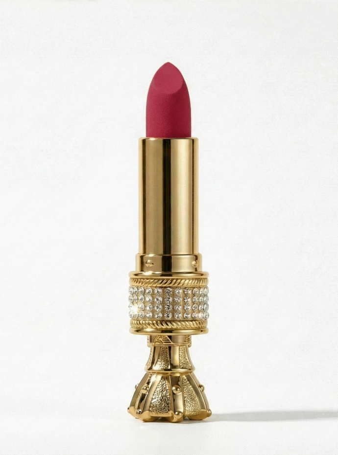 Elevate your beauty routine with our halal-certified luxury lipstick. Designed with a unique crown-top and white leather case, it’s more than makeup; it’s a statement of elegance and values.
